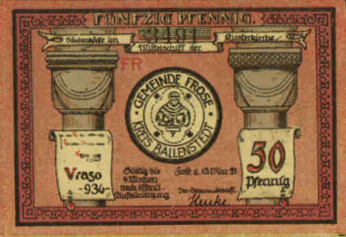 Für Frose / Anhalt gestaltete der damalige Lehrer Willy Dockhorn das Notgeld.