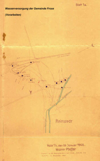 Vor über 100 Jahren war der weithin sichtbare Froser Wasserturm ein Zeichen des technischen Fortschritts. Seither gehört er mit seiner Höhe von etwas mehr als 28m und einem Durchmesser von ca. 7,70m zur Silhouette der Gemeinde Frose. Logischer Weise war das aber nicht immer so. Wasser ist eine der notwendigen Voraussetzungen für menschliche Siedlungen. Die erste bekannte Dorfstelle lässt sich durch zwei Begräbnisstätten beschreiben. Die Eine - das Gräberfeld in Richtung Hoym bildet die Steinkisten- und Hausurnenkultur der frühen Eisenzeit des 7.Jahrhunderts vor unserer Zeitrechnung ab. Die Zweite - Der ehemalige Friedhof nördlich des Angers, also Leopoldstraße - Schulstraße, beschreibt den ersten christlichen Friedhof der Sebastiansgemeinde. Daraus folgt, dass die dazugehörige Siedlung, das „Unterdorf“ Frose, sich auf der Fläche des heutigen Angers befand. Hieraus ergibt sich die Frage nach der Wasserversorgung dieser Siedlung, denn heute ist weder ein Brunnen noch ein fließendes Gewässer vorhanden. Ein Blick in die Vergangenheit zeichnet aber ein anderes Bild. Als „Mühle“ wird auch heute noch ein Wohnhaus an der tiefsten Stelle der Nachterstedter Straße bezeichnet. Eine Mühle in dieser Senke ist nur als wassergetriebene Anlage denkbar. (Die später errichtete Froser Windmühle stand am Rande des heutigen Tagebaurestloches unmittelbar neben den Gleisen.) Dies bedeutet, dass ein Wasserlauf in ausreichender Stärke und Kontinuität für den Betrieb vorhanden war. Dieser führte über die Mittelstraße mit der ehemaligen Gemeindebäckerei, Kreuzung Hoymer Straße, der Leopoldstraße über den Anger zum Bahnhofsgelände. Dort befindet sich auch heute noch mit 127,4 m (NN) der höchste Punkt des Ortes. Und genau an dieser Stelle war das Quellgebiet, welches die Siedlung mit dem lebensnotwendigem Nass versorgte. Aufklärung über diesen Sachverhalt gibt ein Bericht über ein Unwetter vom 13. Juni 1826. Darin steht geschrieben, so Lohse: „Nachdem es zuvor geregnet hatte, hagelte es dreiviertel Stunden lang. Der Wind hatte sich aufgemacht, er entwurzelte Bäume, Blitzstrahl und Donner gaben der Untergangsstimmung ihre besondere Färbung, Wasser über vier Fuß hoch drang ins Dorf, weichte die Häuser ein, dass dieselben zusammenstürzten, die Bewohner schrien um Hilfe, Pferde scheuten vor dem Strom, Wände, Steinmauern und große Obstbäume wurden umgeschlagen, Hausgeräte schwammen fort; Löcher, 7 bis 8 Fuß (ca. 2,40 m) tief und 16 bis 18 Fuß (ca. 5,40 m) breit entstanden und vieles Vieh ertrank.“ Die Leistung der Quellen und die Menge an Regenwasser überschritten um ein Mehrfaches das Fassungsvermögen des Wasserlaufes. Dieser Sachverhalt wurde bei der letzten Sanierung (2016) des Systems mit der Verringerung des Querschnittes des Wasserlaufes ignoriert. In den Jahren nach 1826 hingegen wurde zur Vermeidung einer Wiederholung eines solchen Unglücks ein Entlastungsgraben beginnend auf der Höhe des noch nicht existierenden Bahnhofs bis zur Straße „Hinter dem Dorf“ geführt und von dort in die See. In einem Lageplan aus dem Jahre 1860/65 ist dieser Sachverhalt dokumentiert. Im Zuge der Entwicklung des Ortes wurden über die Jahrhunderte zusätzlich eine Reihe von Brunnen angelegt, um die neu entstandenen Gehöfte mit Wasser zu versorgen. Eine konkrete Zahl ist aber nicht mehr nachvollziehbar. Einzelne noch heute bekannte Standorte sind: Der Bornwinkel in der „Neuen Reihe„, die Wasserstelle am OdF-Denkmal („Der Plan“) und die Pumpe gegenüber dem Feuerwehrgebäude. Mit anderen Worten - Wasser war hier immer in ausreichender Menge vorhanden und eine Bevölkerungsentwicklung, die einen Wassermangel verursachte, gab es nicht. In der Ortslage Frose sind heute noch Zeugnisse an reichem Grund- und Oberflächenwasser nachweisbar. Mit dem Beginn des Bergbaues veränderte sich dieser Sachverhalt dramatisch. Der Wasserspiegel sank stetig. Einzelne Brunnen waren im Jahre 1900 bis auf die Kohle getrieben worden und trotzdem konnte die Wasserbereitstellung für Mensch und Tier auf diesem Wege nicht mehr gesichert werden. Die einzige Lösung dieses Problems war der Bau einer Wasserversorgung für den gesamten Ort. Einer der ersten praktikablen Vorprojekte 1901/1902 waren die Erschließung eines Quellgebietes am Froser Berg in der Gemarkung Reinstedt. Diese Bemühungen scheiterten an dem Veto der Gemeinde Reinstedt. In einem späteren Gutachten wurde zudem festgestellt, dass dieses Quellgebiet im direkten Zusammenhang zum Wasserstand der Selke stand und somit ebenfalls die gewünschte Versorgungssicherheit nicht gewährleistet hätte. Es wurde die Suche nach einem stabilen Quellgebiet fortgesetzt. Schließlich und endlich wurde Wasser in ausreichender Qualität und Menge am Ortsausgang in Richtung Königsaue gefunden. Mit der Sicherung der Finanzierung begann der Bau der Pumpstation, des Wasserturmes sowie des dazugehörigen Leitungssystems. Dieses Projekt wurde 1906 abgeschlossen und in Betrieb genommen. Die Gesamtkosten beliefen sich auf 114 000,00 Mark. Bereits 1909 bekam die Stadt Aschersleben Probleme mit ihrer Wasserversorgung. Eine langwierige Suche nach den geeigneten Wasservorkommen sowie zäher Verhandlungen zur Errichtung der technischen Anlagen, Wasser- und Steuerrechte der beteiligten Städte und Gemeinden errichteten die Anhalter Kohlenwerke 1912 in ihrem Tagebau in Frose ein Wasserwerk. Sie hatten sich vertraglich verpflichtet nur das aus dem Berg tretende Oberflächenwasser zu fördern. Dem entsprechend waren die Quellenfassungen ausgelegt. Aber die in den Folgejahren errichteten Brunnenbauwerke sprechen eine andere Sprache. Seitens der Gemeinde Frose wurde 1934 der Versuch unternommen, einen neuen Vertrag außerhalb eines Rechtsstreites zu erreichen. Ein diesbezüglicher Erfolg schien nach der Machtergreifung A. Hitlers auf Grund von Veränderungen im Staats- sowie Rechtsgefüge aussichtsreich. Am Ende der Bemühungen musste die Gemeinde Frose je